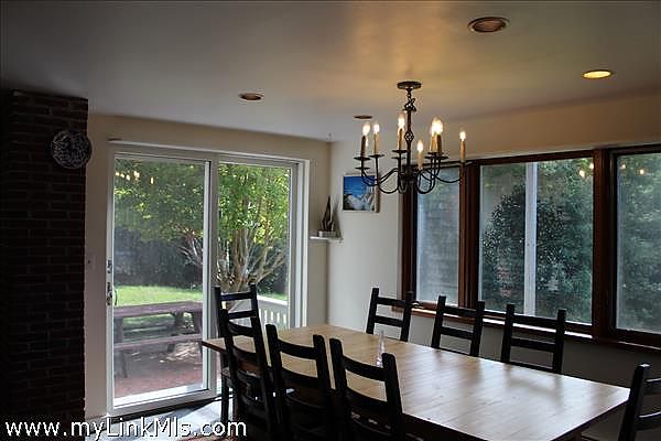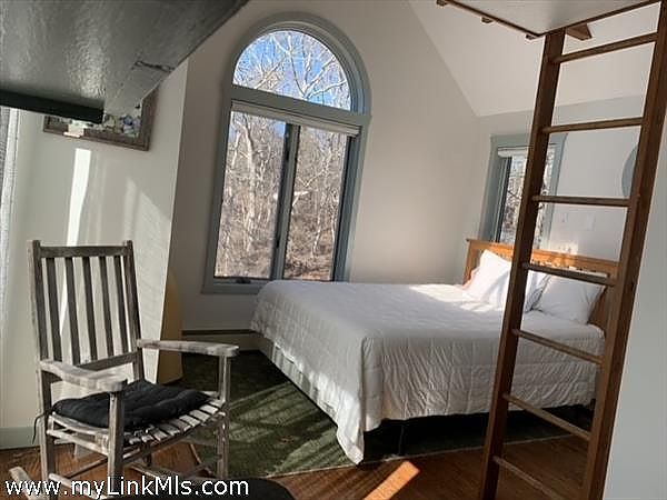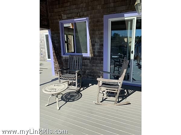Enter Main house from the covered porch -matching custom arch doors lead you to either the mudroom/laundry room-kitchen entry, or the living room. The kitchen has Mexican tiled floor & granite counters with stainless steel appliances & gas 4 burner cooktop. & Double wall oven. Eat in Kitchen dining area with lots of natural light and 2 glass sliders to the deck and patio. The pantry hallway leads to living room (off hallway) is a full bathroom with glass block tiled shower. Open Livingroom with cathedral ceiling and wide pine floors. Slider leads to covered porch and back deck. Versatile floor plan with many options for accommodating multi-generational living, au pair suite bedroom with loft, home office or privacy for guests with their own entrance. Another large bedroom is located just off the living room. The back of the house is wrapped with a 30x20 deck, with distant water views of Vineyard Sound & Tarpolin Cove on Naushon.