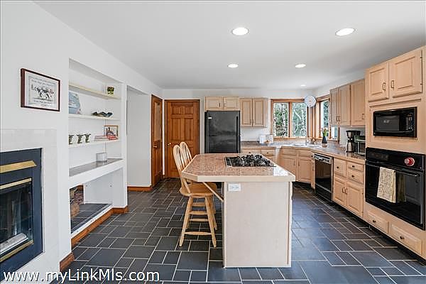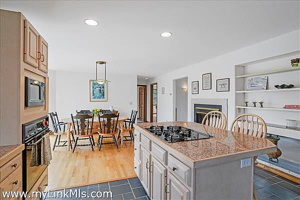 The kitchen, filled with natural light, flows seamlessly into the dining area—ideal for everything from casual breakfasts to festive dinners. The fireplace adds a cozy ambiance, making the space feel truly like the heart of the home.