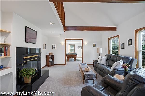 This charming Cape-style home, built in 1992, is tucked away in a quiet, subdivision on South Vine Lane. With three bedrooms and two bathrooms, it blends classic Island character with modern comforts. The inviting living room features vaulted ceilings and a double-sided fireplace, creating a bright and spacious atmosphere perfect for both relaxing and entertaining.
