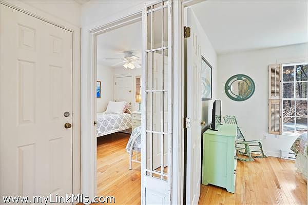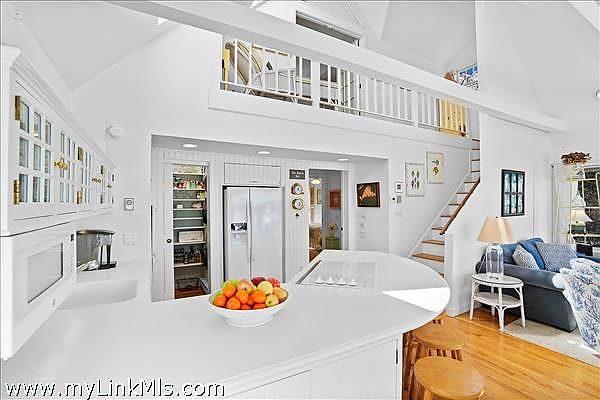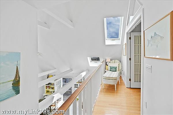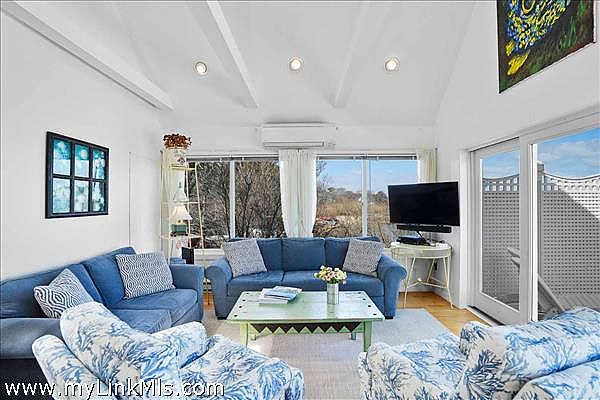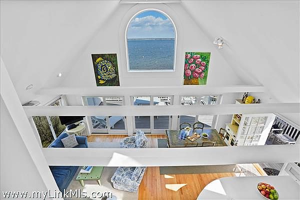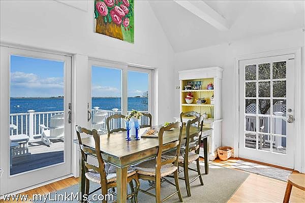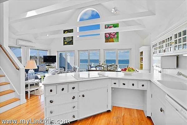 As you step inside, you'll be greeted by a bright and airy open living space featuring an casual dining area and a well-appointed kitchen. The all-white interior is beautifully accented by warm hardwood floors and vaulted ceilings, illuminated by skylights and enhanced by the comfort of air conditioning and ceiling fans. Three sets of sliding glass doors extend the living space onto a spacious mahogany deck, perfect for savoring the breathtaking water views.