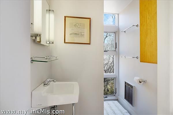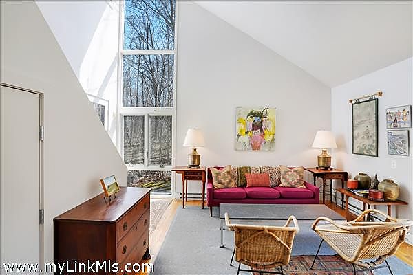 Perched atop Fulling Mill Hill this distinctive contemporary main house plus guest house offers mid-century charm and a serene retreat set on 3.3 acres of mature oak and beech forest and bordered by an ancient stone wall. Designed by renowned Yale School of Architecture Dean Paul Mitarachi, the main house features a striking circular entryway framed by mature Asiatic gardens. Step inside to discover a custom circular staircase with dramatic floor to ceiling windows, leading to the upper living area flooded with natural light from the wall of south-facing windows. The living area with high ceilings and woodstove is a comfortable place to congregate, while the kitchen and open dining areas lend themselves to modern day living. Glass sliding doors open onto a spacious 2nd story deck giving the entire living space an intimate relationship with the outdoors. On the first floor there are three total bedrooms; two bedrooms sharing a full bath plus a primary bedroom with a full bath en-suite.