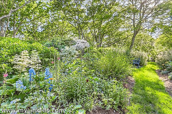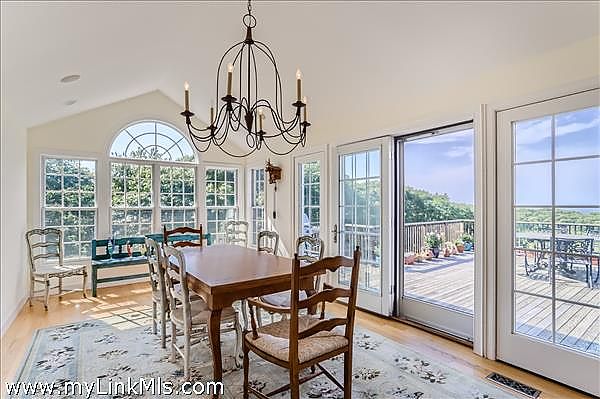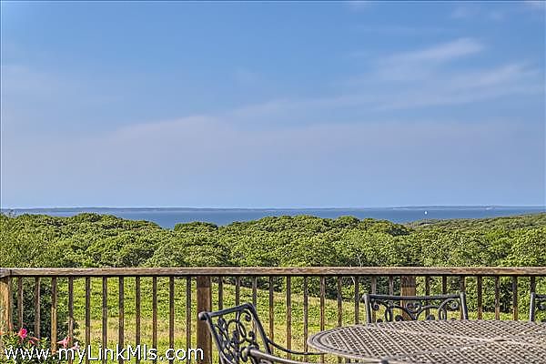 Perched high on the north shore with sweeping views of the Vineyard Sound, this expansive and private property is surrounded by Menemsha Hills conservation land and trails and offers broad water views, even from ground floor of house. The house is large and well maintained with an upside down floor plan allowing for high ceilings and bright spaces in the open plan kitchen/dining/living room, as well as the primary bedroom suite and office on this upper level. This is a great house for entertaining and offers A/C, screened porch, generator, music system, outdoor lighting and other perks. The exterior space features a tennis court, beautiful gardens with water feature, and a cleared meadow, which is several acres in size, surrounded by woodlands. No other houses can be seen from here. A pool is possible and there is plenty of space for this addition. Subdivision potential. Includes Brickyard Beach rights.
