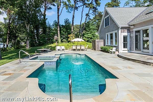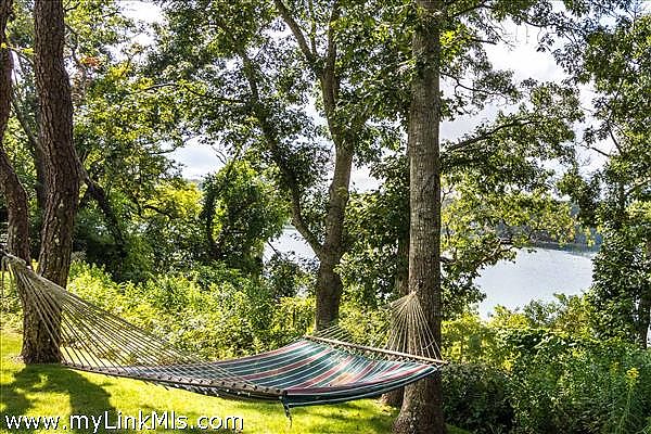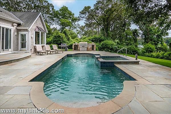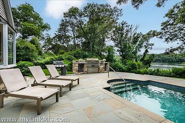 Step outside to a world of leisure and relaxation. The heated pool, with a built-in whirlpool spa and bluestone terrace, is ideal for warm summer days. An outdoor kitchen invites alfresco dining, while a hammock offers a peaceful afternoon retreat. The lagoon waterfront, with stairs to a sandy beach, provides calm waters for swimming, kayaking, and paddleboarding, and the ability to secure a mooring.