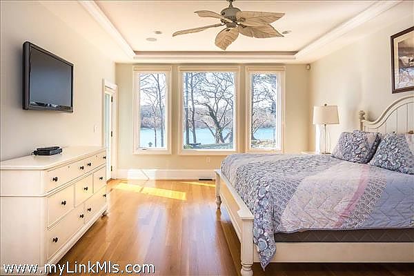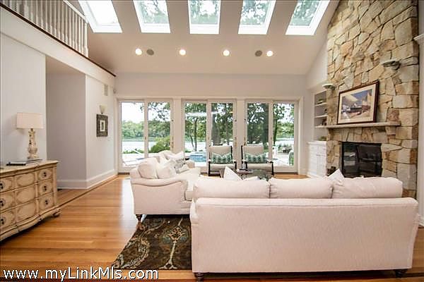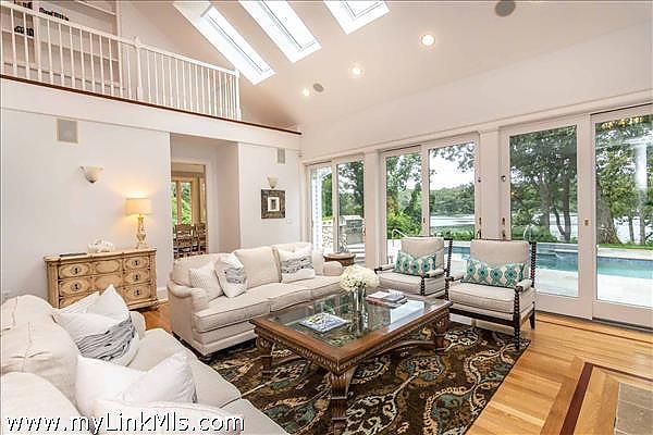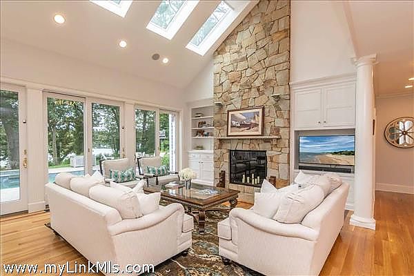 Enter through the grand foyer to discover dramatic interiors with soaring ceilings, skylights, and floor-to-ceiling windows that capture breathtaking water views. The open staircase and stately columns add grandeur, while a handsome stone fireplace and custom built-ins provide warmth and sophistication.