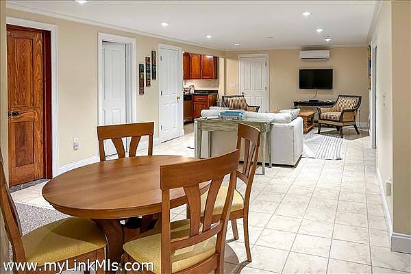 The gourmet kitchen is a dream for cooks and entertainers alike, featuring custom cabinetry, stone countertops, and stainless appliances. An expansive kitchen island and a wet bar with beverage refrigerator and ice maker enhance the entertaining experience. Adjacent, a spacious dining area with custom built-ins is perfect for memorable gatherings.