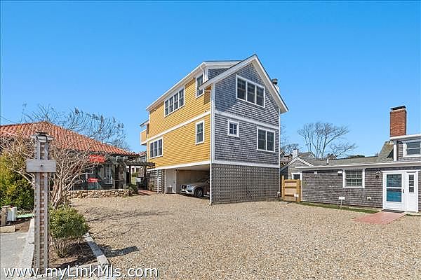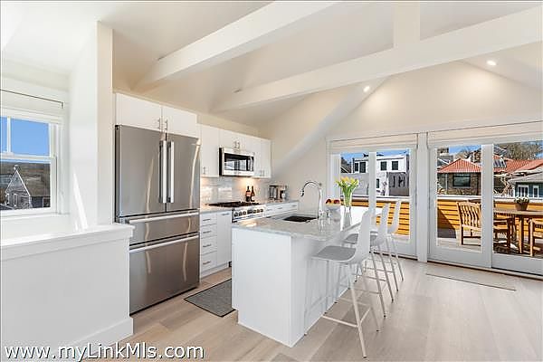 Waterview Condo in the Heart of Downtown Vineyard Haven. Experience the best of in-town living with this newly built, thoughtfully designed 2-bedroom condo offering beautiful harbor views and luxurious modern finishes. The first level welcomes you with a primary suite featuring a full bath with a tub/shower combination and direct access to a private deck complete with an outdoor shower—perfect after a day at the beach. Also on this level is a comfortable guest bedroom with peaks of the harbor, a stylish full tile bath with a glass-enclosed shower, a cozy living area, and washer/dryer for convenience. Upstairs, cathedral ceilings and a gas fireplace create an inviting open-concept living space. The gourmet kitchen is outfitted with sleek Bosch appliances, a large center island ideal for entertaining, and an adjoining dining area. Enjoy panoramic water views of the harbor, passing ferry boats, and Vineyard Sound from the entire second floor, or step out onto your private deck—perfect for alfresco dining or morning coffee. Just steps from your door, a private path leads to the association’s sandy harbor beach, where you can store your kayak or launch your boat. This condo also includes a dedicated parking space and an enclosed storage area under the house—ideal for bikes, beach gear, or seasonal items. With easy access to downtown shops, restaurants, ferry terminal, and local beaches, this condo offers the ultimate combination of luxury, convenience, and island charm. A rare opportunity for carefree coastal living on Martha’s Vineyard.