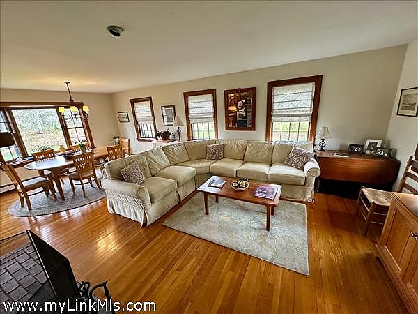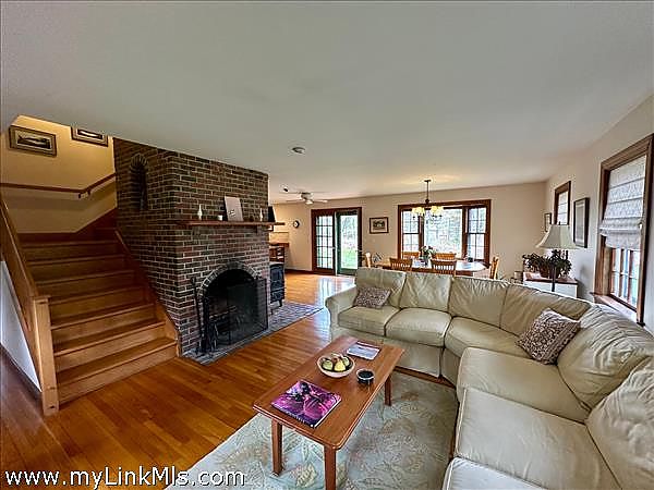 This Cape Style home privately sited on 1.89 acres at the end of a cul-de-sac abutting conservation land with many walking trails. Nice features include spacious living spaces that include a well equipped kitchen with custom cherry cabinets, dining room, living room with fireplace, wood stove and french doors that lead you out to a private patio and backyard. Second floor offers two guest bedrooms, primary bedroom and full bath. There are wood floors throughout, a butler's pantry off the kitchen, full basement with a dormered bulkhead. The owner, a cabinetmaker and finish carpenter currently has it set up as a workshop. The nicely landscaped yard with mature plantings and gardens offers a peaceful setting. There is also a garden shed for garden and outdoor equipment.