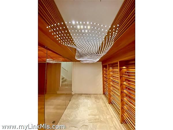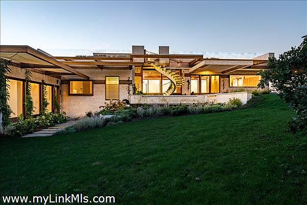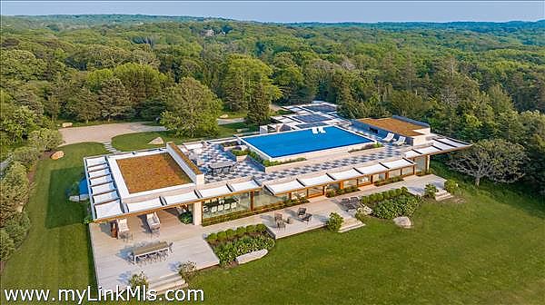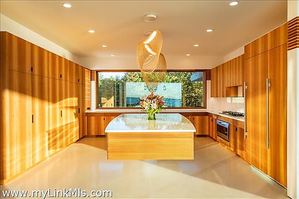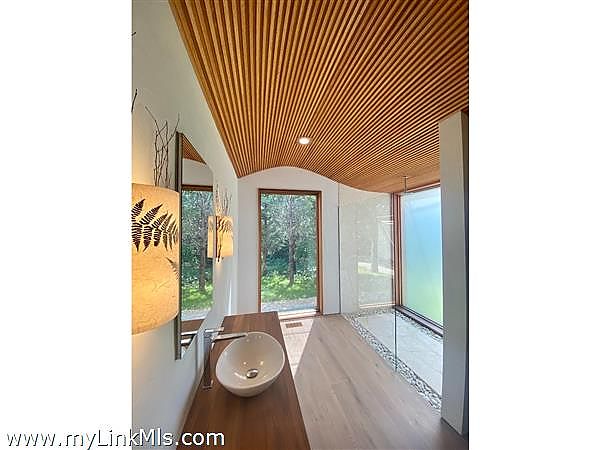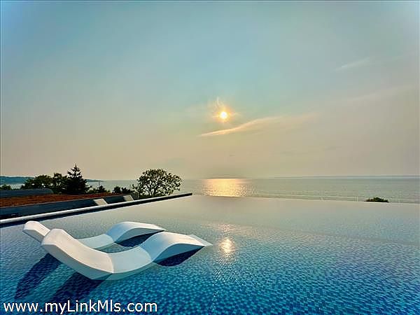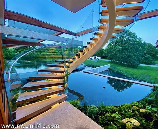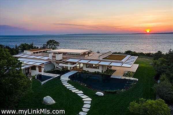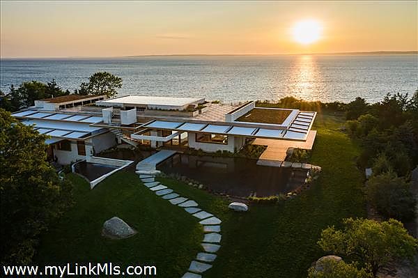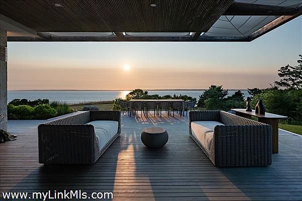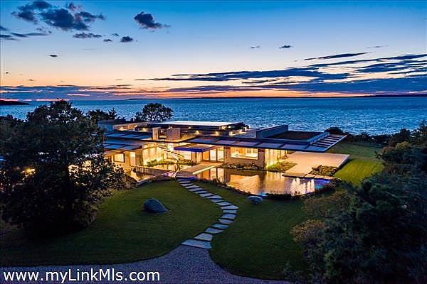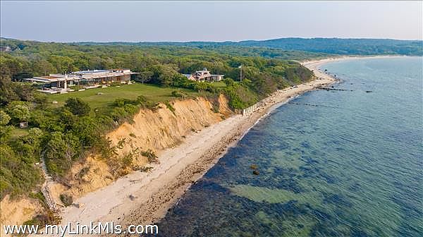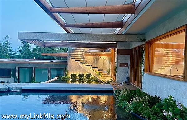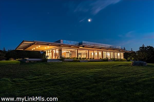 This North Shore beachfront estate represents one of the most breathtaking properties in all of New England. The newly built home was created on a 3.3-acre parcel of land, surrounded by specimen trees, rolling grassy meadows and is highly situated on a stable bank overlooking nearly 250 ft of sandy beach. The home, which celebrates and was imagined utilizing the 14 patterns of biophilic design, fosters positive and sustained interaction and relationships among people and the natural environment. The entrance to the home leads across enormous granite steppingstones bridging over expansive reflection ponds with two waterfalls cascading to a lower-level pond. The entry way welcomes one to open and dramatic living spaces with 10 ft ceilings and large expanses of glass facing Vineyard Sound and the surrounding landscape. In the main residence, each of the five-bedroom suites have unique features and connect with the beauty of the outdoors. The lower level of the residence offers amazing, eye-catching living spaces which include state of the art wine cellar, entertainment room, media room, gym and sauna. There is a spectacular glass circular staircase leading to a roof top pool which is surrounded by expansive decks and gardens and offers what is arguably the best place one could choose to watch the sunset each evening. The residence offers countless distinctive features and green technologies including self-sustaining solar energy. Minawetu is essentially a platform for a botanical garden, one with nature and a harmonic part of the island’s environment. Complimenting the property is a detached accessory building with two rooms and two full baths which is designed in harmony with the main house and constructed with the same level of detail. This outbuilding would also be a perfect place for a removed office or studio space. While it’s a short walk to the main residence, it enjoys privacy and it’s owns views over wild flower covered meadows. The landscaping is an incredible blend of open, natural settings complimented by the botanical gardens which grow on and around the house. There is a weathered stone staircase providing easy access to a white sandy beach. There are so many spectacular properties on the island of Martha’s Vineyard, each offering their own incredible features but there truly is no other property that captures the magic of Minawetu.