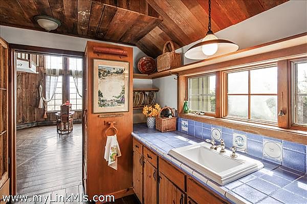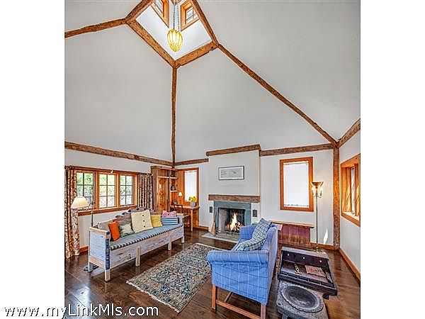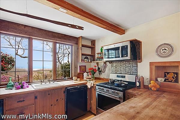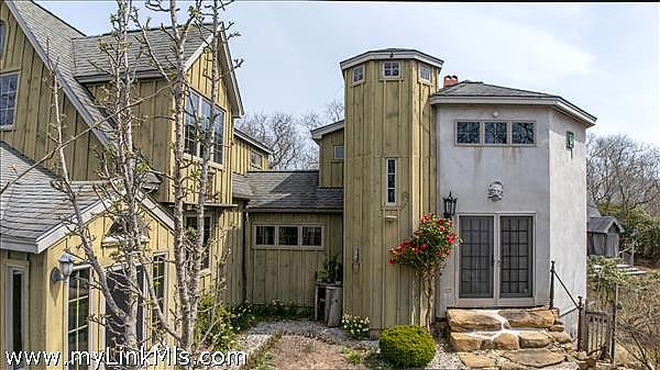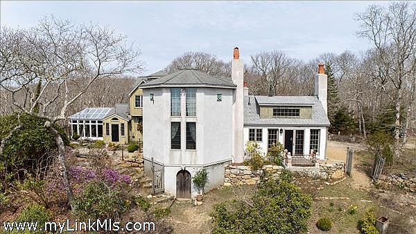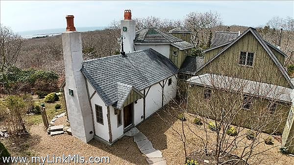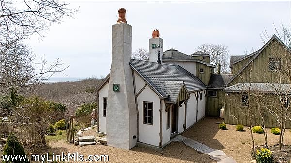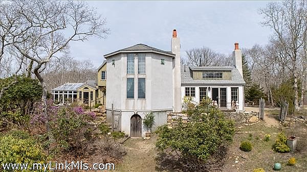 Dreamlike Chilmark retreat on 4.5+/- acres overlooking the Chilmark Pond & Atlantic Ocean beyond. Uniquely designed with European and medieval history in mind. The House has 3 bedrooms, 3 bathrooms, an atrium dining area, a two-story library, a kitchen, and a pantry/wet bar. Charming garden and plantings surround the home.