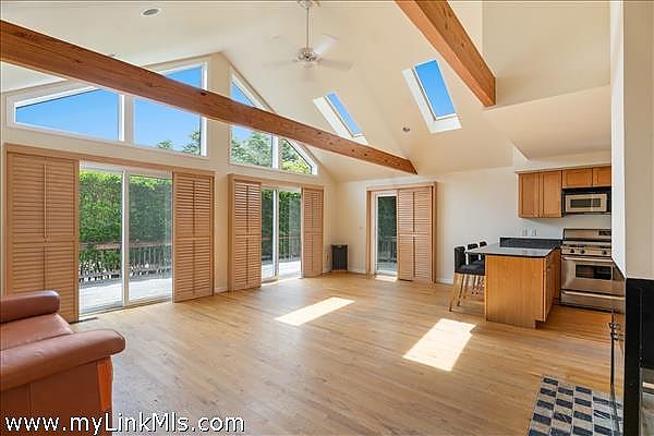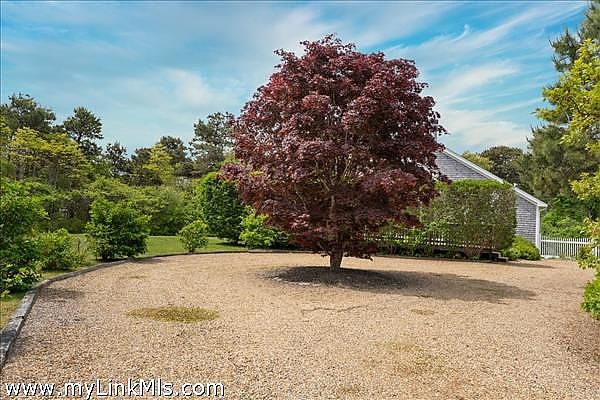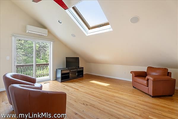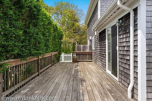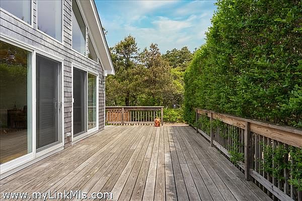 Vacation Getaway in Edgartown Estates - This sunny and welcoming contemporary could be yours this summer! With an open layout, vaulted ceilings, and lots of windows and glass doors, the home feels bright and airy. Step outside to a spacious wrap-around deck—great for relaxing or entertaining. Inside, the living, dining, and kitchen areas flow nicely and are just the right size for gathering. The first floor has three guest bedrooms, while upstairs you’ll find a loft, the primary bedroom suite, and a private balcony. Other features include hardwood floors, air conditioning, a full basement, and an outdoor shower—perfect after a day at the beach. The half-acre lot offers a nice lawn with mature trees and plantings that give privacy from the road and neighbors. The location is excellent, just off the bike path to South Beach or into Edgartown Village. Come take a look!