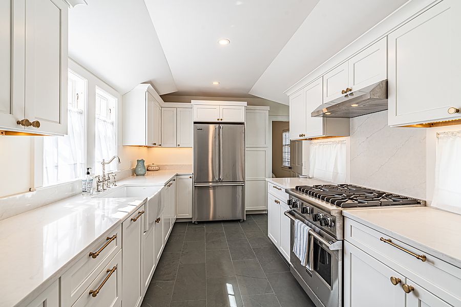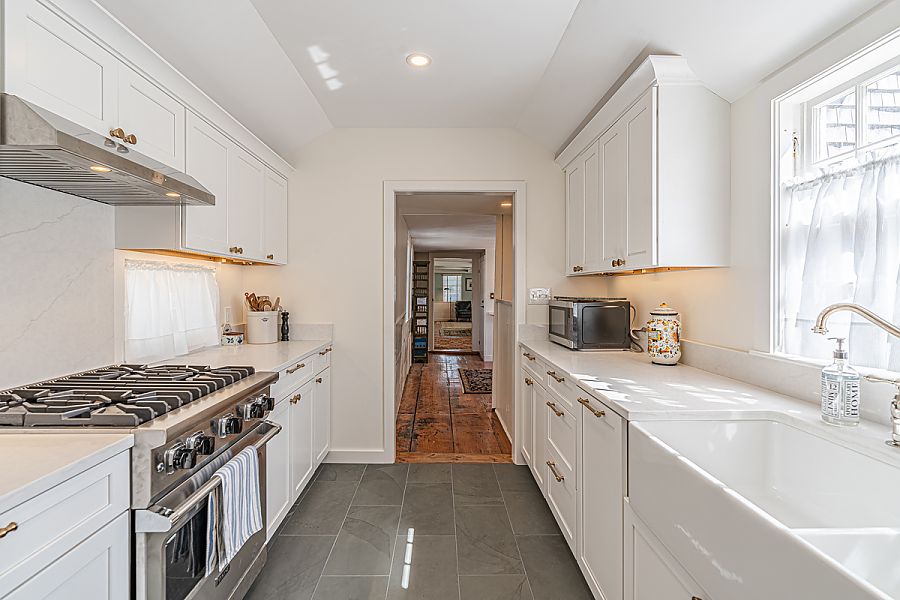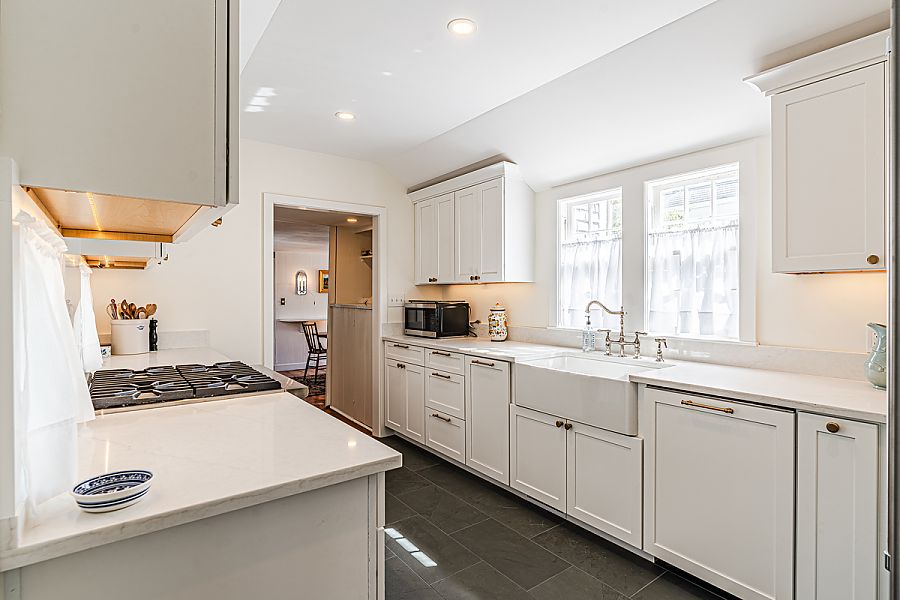 The updated kitchen is a chef’s dream, equipped with high-end appliances, a farmhouse sink, custom cabinetry, and everything needed for cooking enthusiasts.
