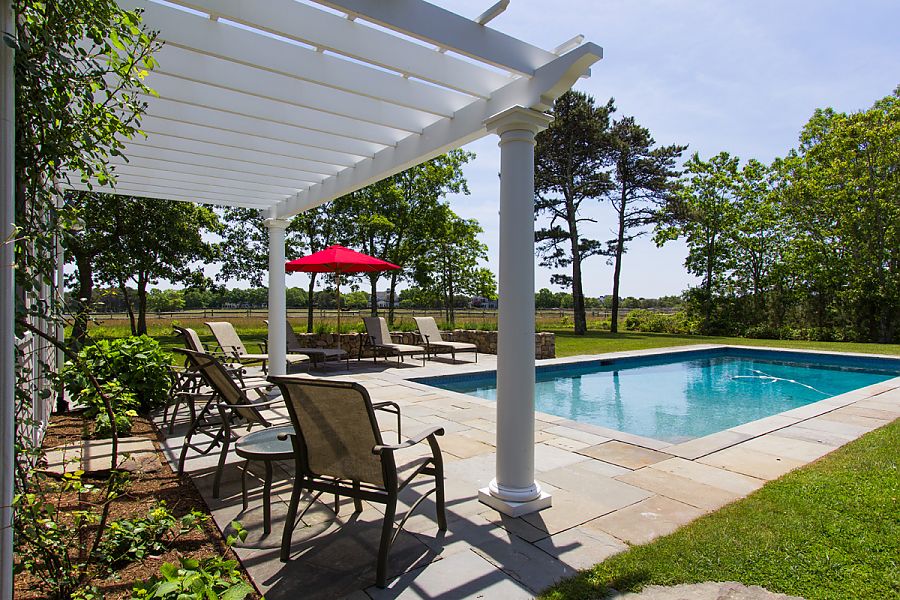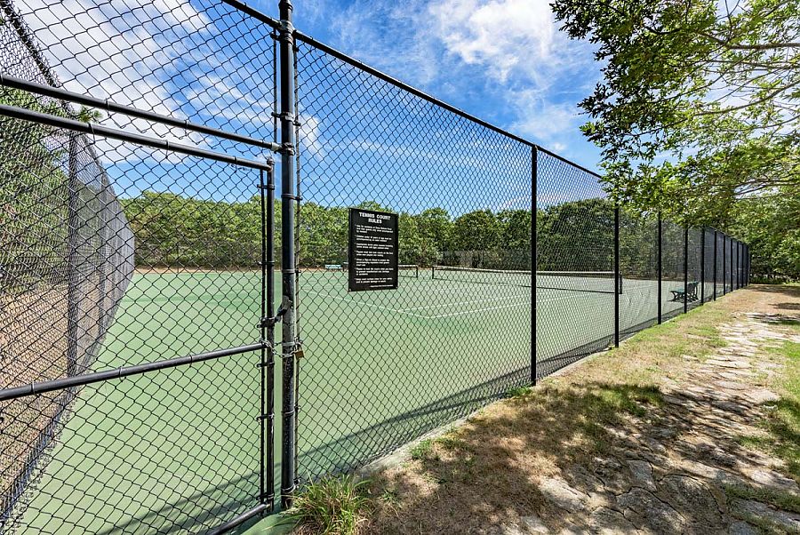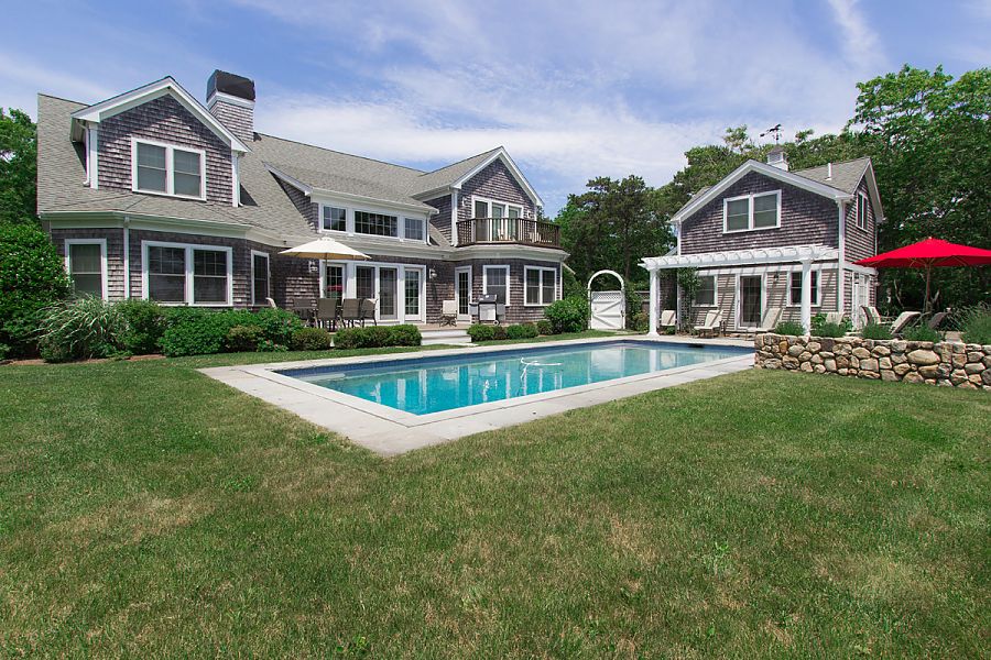 Contemporary home in the Deep Bottom area of West Tisbury. This gracious home with a pool and patio overlooks the open meadowland that is the Deep Bottom. The home is professionally landscaped and there is a spacious stone patio area surrounding the pool. The detached pool/guest house hosts bedroom number 5 on the 2nd level and a bath on the first level.  Tennis enthusiasts will enjoy the well-maintained association tennis courts.