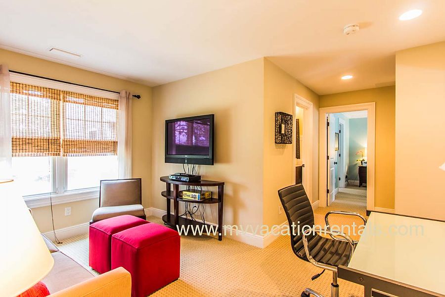 The 2nd level primary bedroom suite is accented with coastal colors and has lovely linens. Two additional guest bedrooms and a shared bath are nicely separated from the primary by the 2nd level TV room.