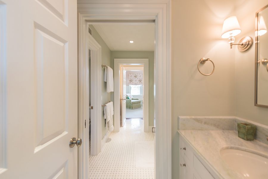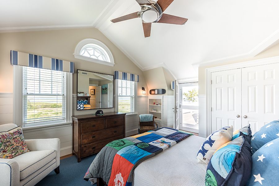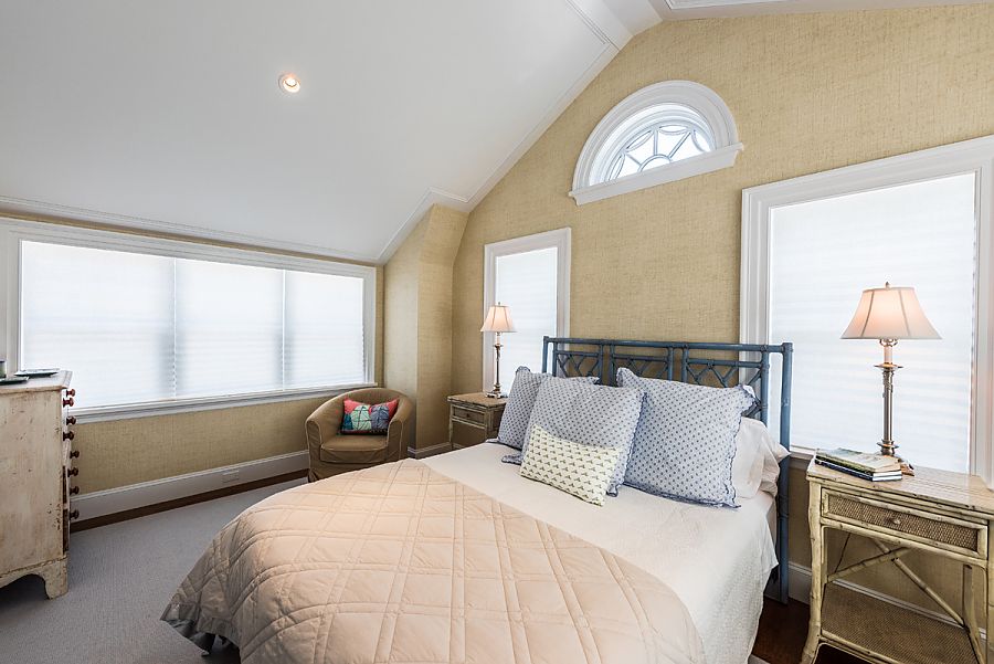 The 2nd level of the main house hosts 5 bedrooms. The spacious Primary Bedroom anchors  the center of the 2nd level and features French doors leading to a private deck with breath taking views over Eel Pond and Nantucket sound and a luxurious bath with separate his and hers vanities, soaking tub and glass walk in shower.   A  large landing separates the two wings of the house where two bedrooms on each share Jack & Jill spacious baths.