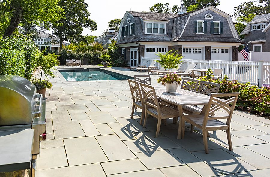The Outdoor Entertainment Area ties the Main House to the Carriage House and this area hosts the 16 x 33 foot gunite Pool with large bluestone surround, hot tub, grill and outdoor dining area and multiple seating areas
