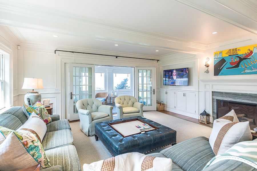 An additional Family Room is located on the main level of the house with a media area and the french doors open to the screened porch, providing additional living area.  In addition there is a private study/office just off of this family room. There is a powder room located on this level.  An additional Media Room on the lower level is comfortably furnished and has a game table and a bath.