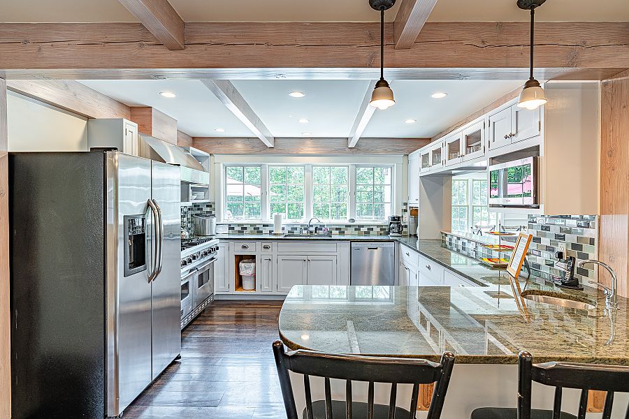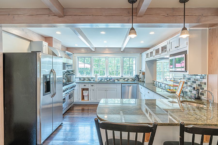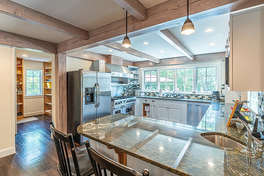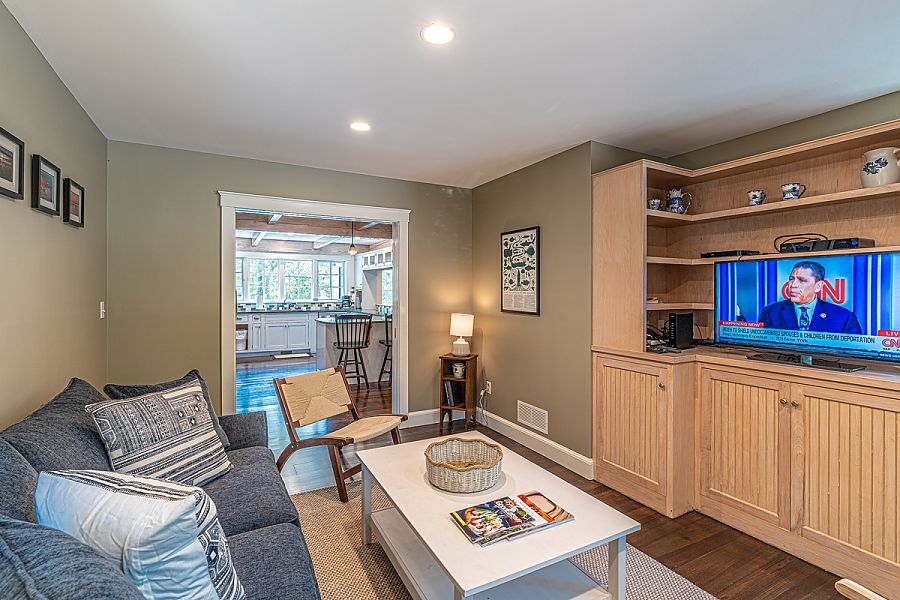 The interior of this large home boasts multiple living spaces, all newly updated. The main living area features an open kitchen, and living and dining areas opening to the pool and patio. There is a TV room just off of the main living area. The spacious kitchen features a breakfast bar,  custom cabinetry, stone counters, a professional gas stove, and a large walk-in pantry/laundry room.  A powder room is located just off the main entry foyer.  The 2nd level hosts a tv room and opens to a lovely roof deck overlooking the pool with steps down to the pool area.
