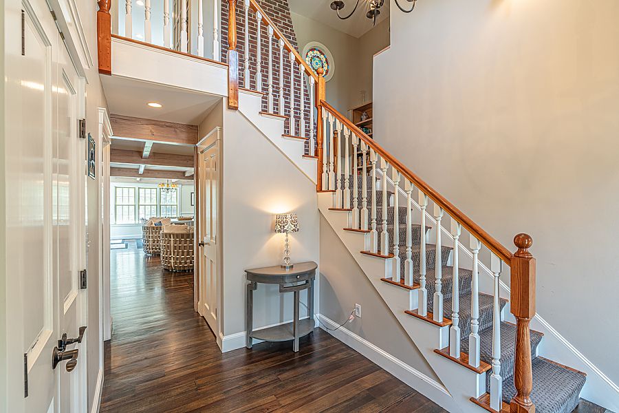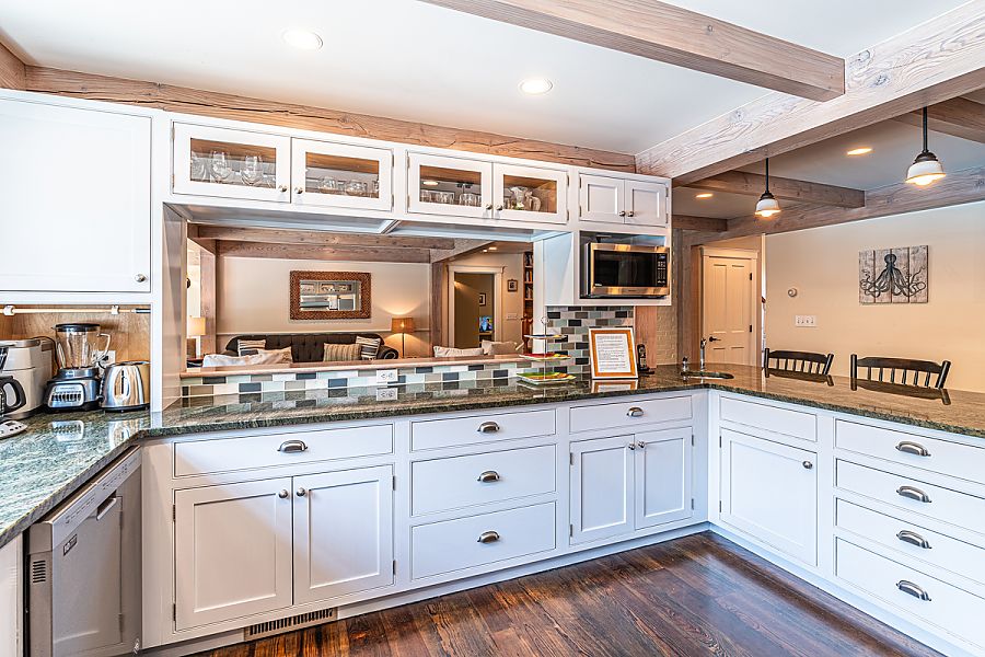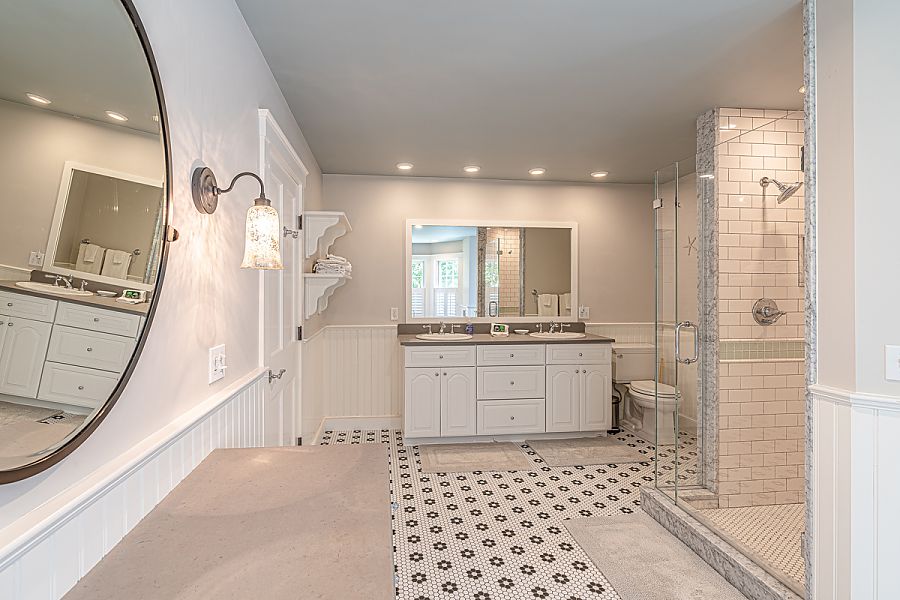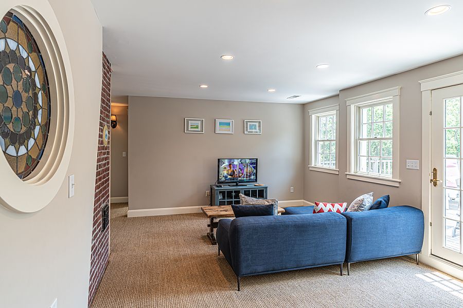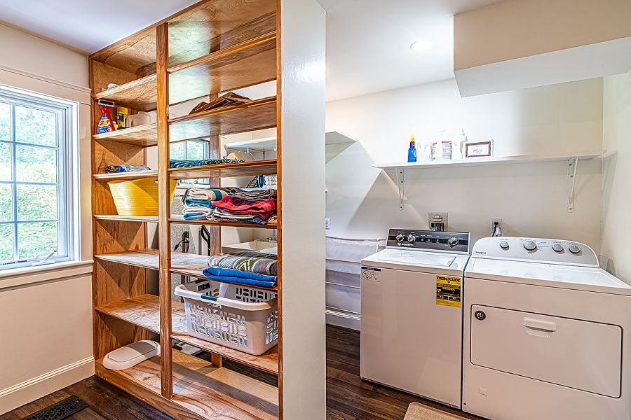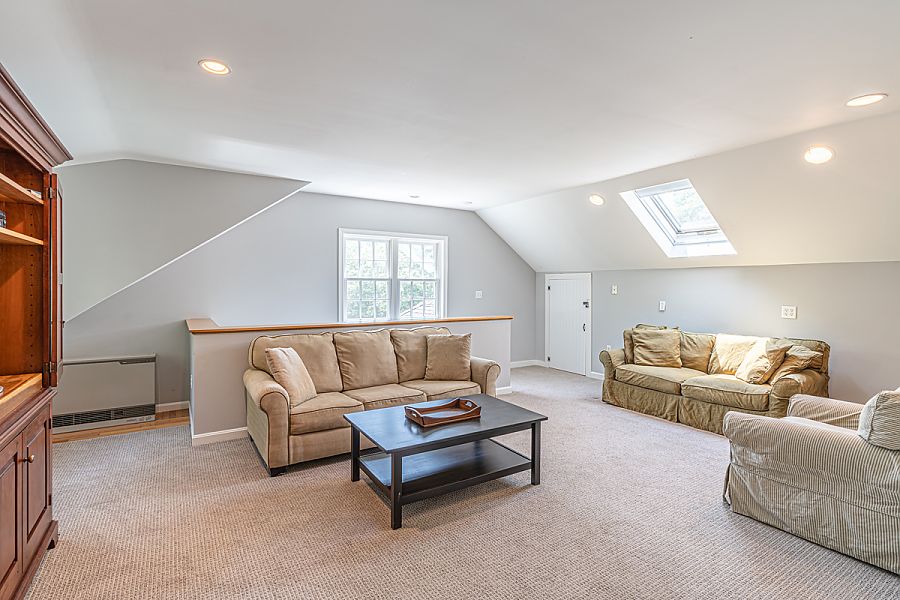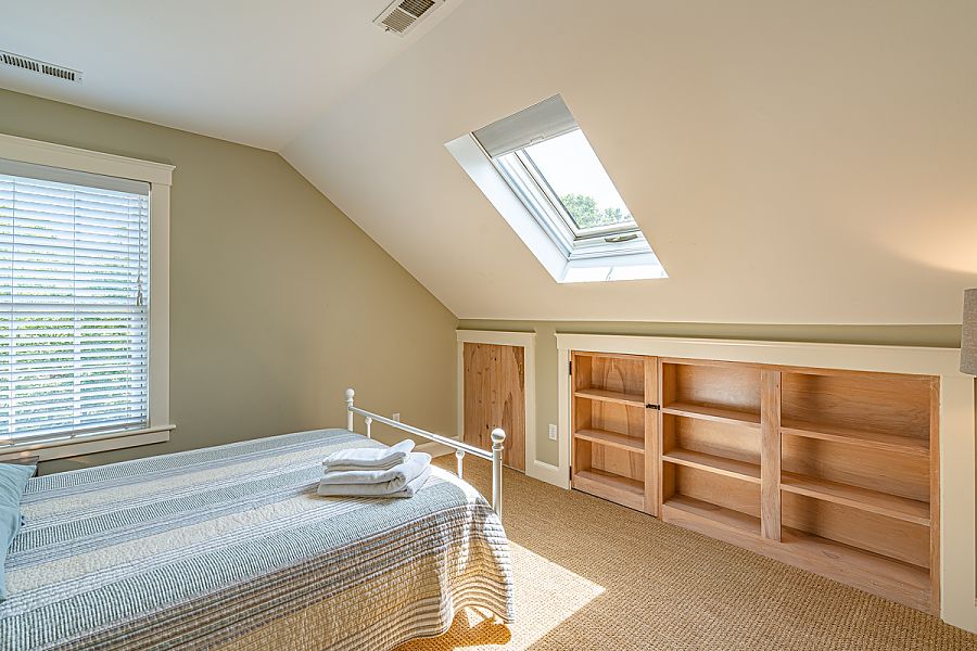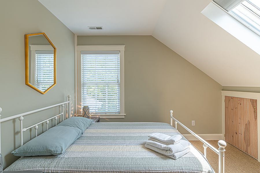Bedroom number five is a separate suite with a King bed located atop the carriage house. This area has a separate TV Room with Futon that opens to a sleeper, an additional bath, and AC. This area is accessible from the house by passing through a breezeway and then 10 or so steps to the outside door!
