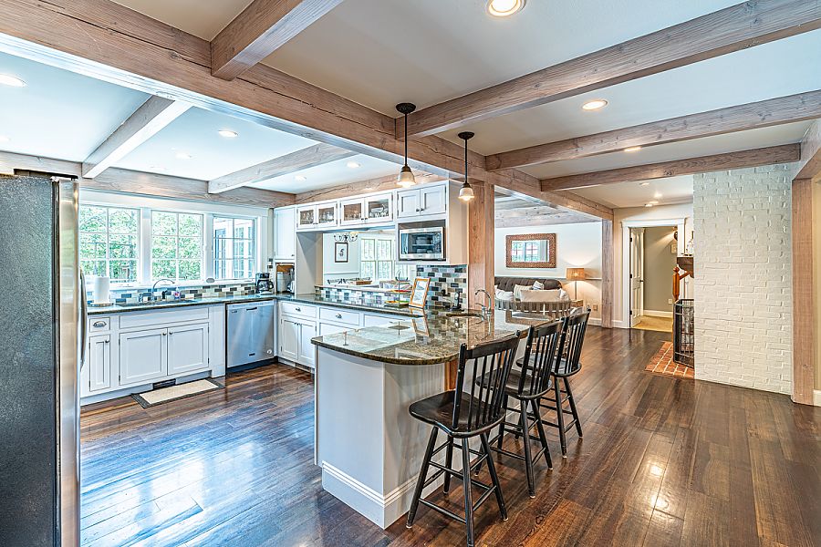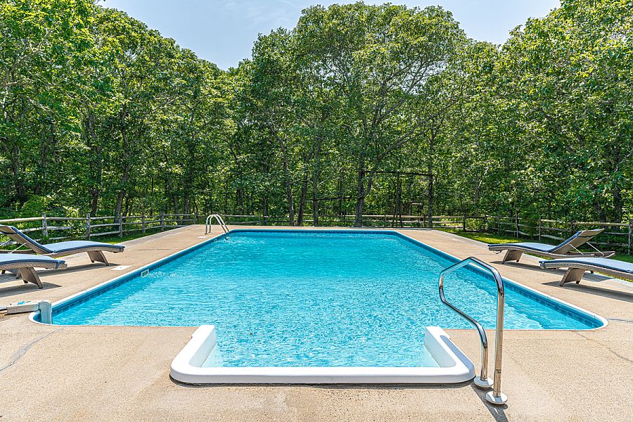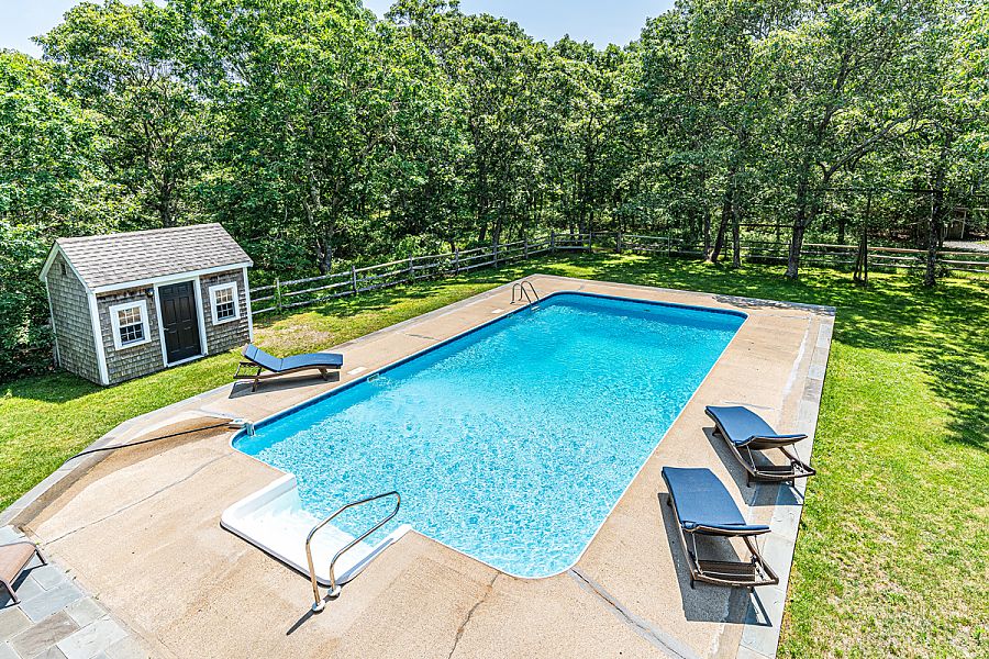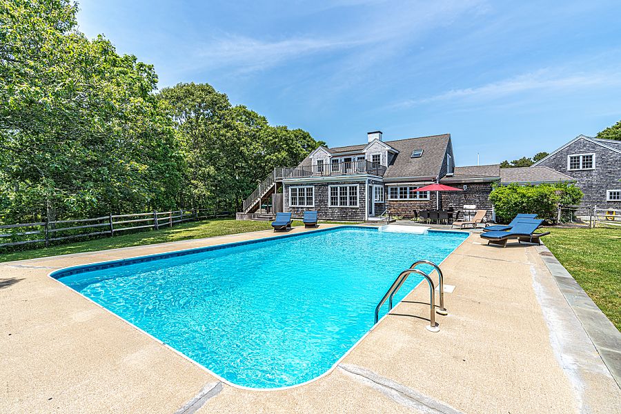 MVVR Exclusive Listing:  Relax in style in this large and comfortable custom post and beam family home with a 20 x 40 heated pool, expansive patio and deck overlooking the pool.  Acres of privacy surround this vacation retreat, convenient location to Edgartown Village center, public beaches just a short drive. Bike paths at the end of the lane connect you to Edgartown Village center and miles of bike touring trails.  Private beach accessible by boat skiff rentals available, - please inquire with agent for details. Kayak rentals can be delivered to the property!
