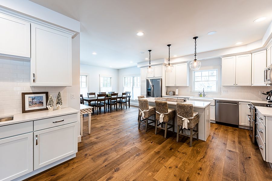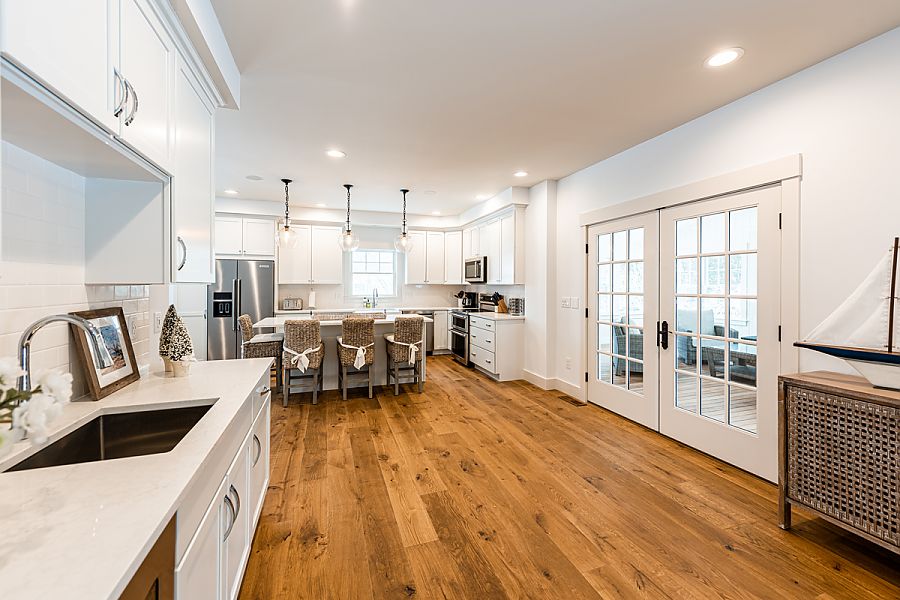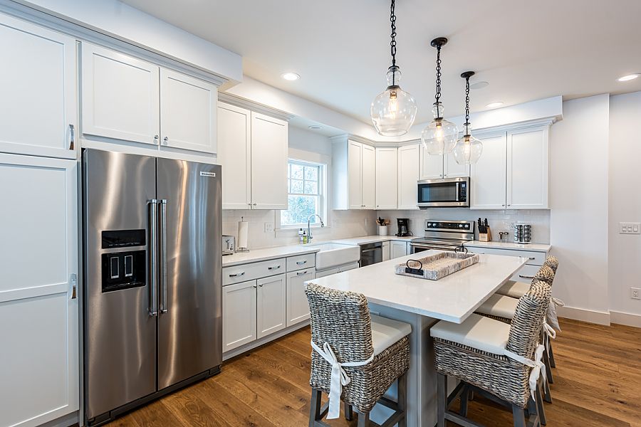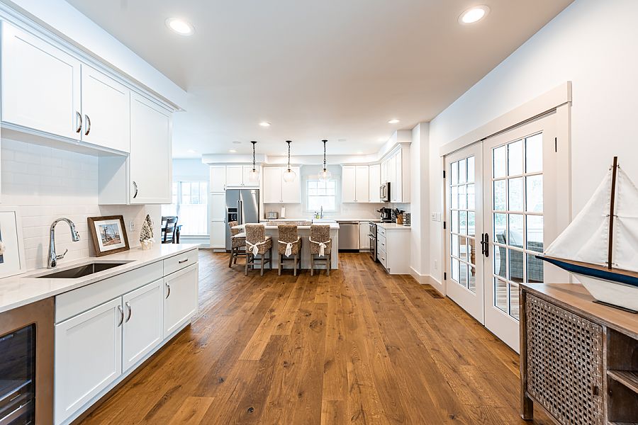 This beautiful four-bedroom home boasts an open-concept living space, including a large kitchen and dining area, as well as a sitting area with a wet bar, beverage cooler and large screen TV.