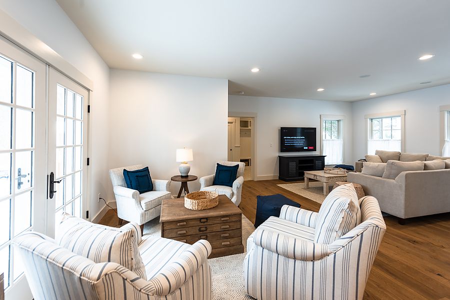 The second floor features a primary suite with a private bathroom and TV, and three additional bedrooms that share a bathroom.