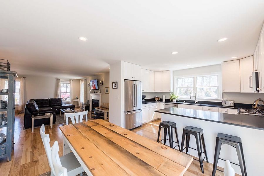 The welcoming first level features today's modern interior with an open floor plan, spacious living area, and sectional sofa seating centered around the media area.  The gorgeous kitchen will please the cooks in the group and there is breakfast bar seating adjacent to the spacious dining area which opens to the deck area.