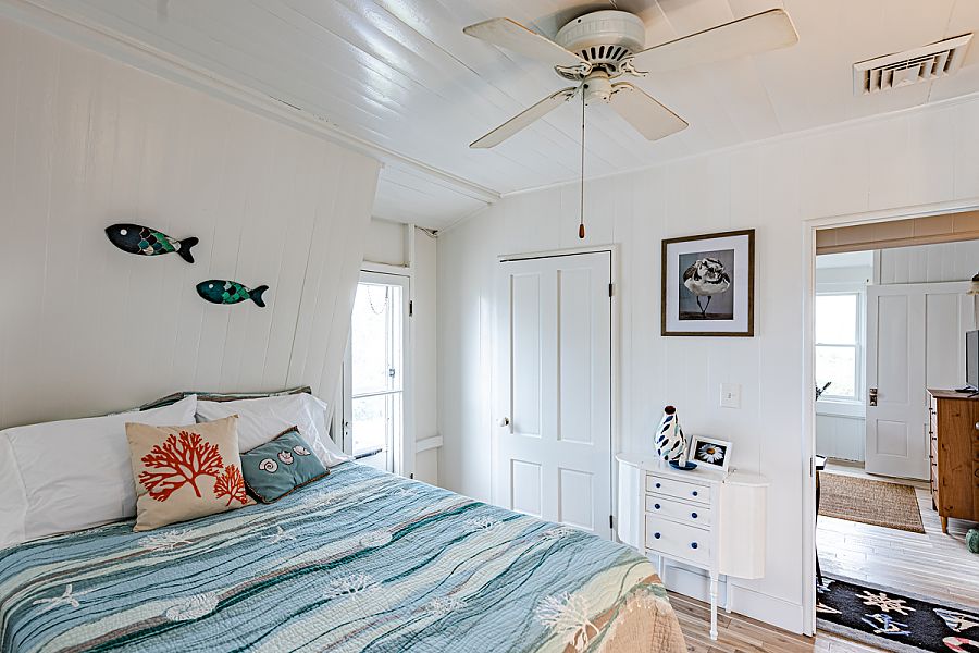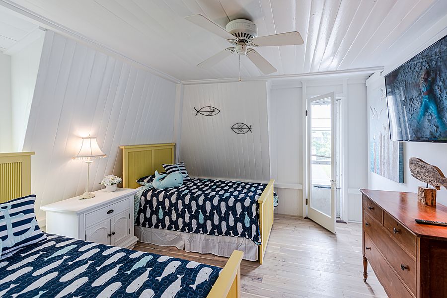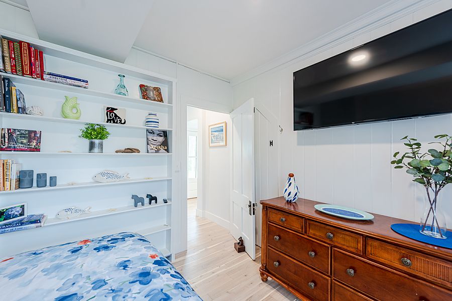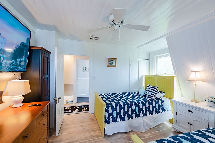 Four bedrooms including the primary bedroom with a water view are located on the 2nd level and the four bedrooms share 2 newly updated baths on the 2nd level.  Each guest bedroom has a smart TV.  Two of the bedrooms have balcony porches with water views. The balcony porches have low rails that do not meet code but are grandfathered.  The doors leading out from the bedrooms to the 2nd level porches each have a lock at the top of the doors for the safety of children.