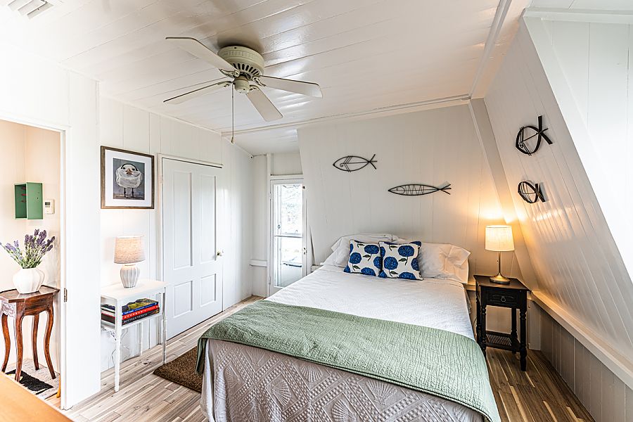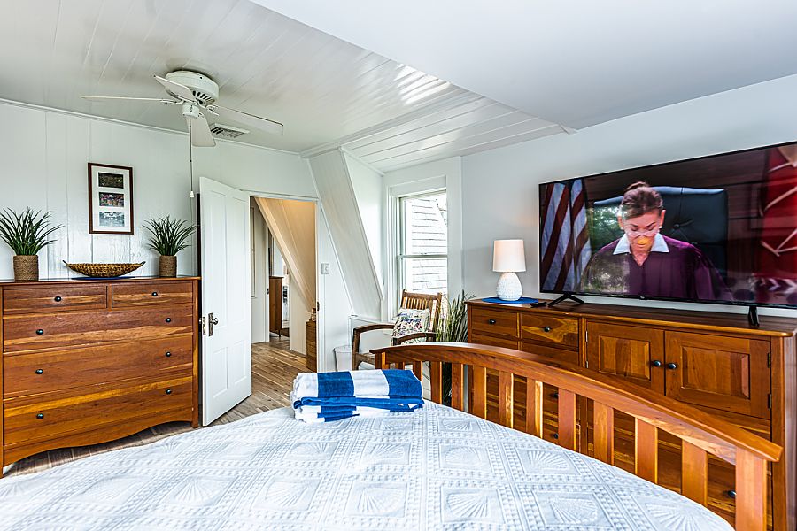 Primary Bedroom: 2nd Level, Queen, TV, Water views, shares two hall baths on 2nd level