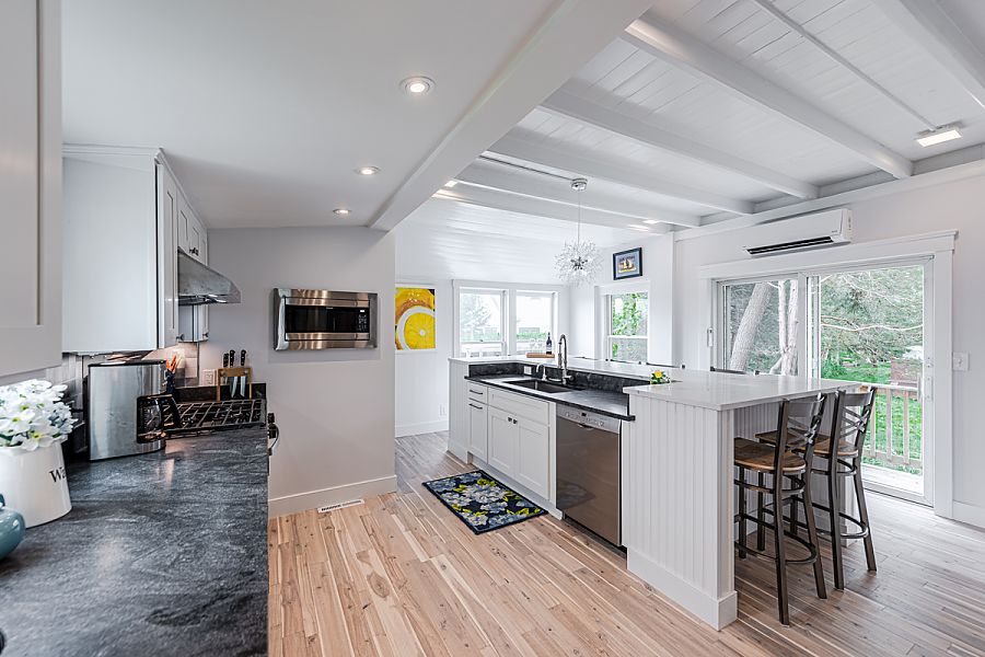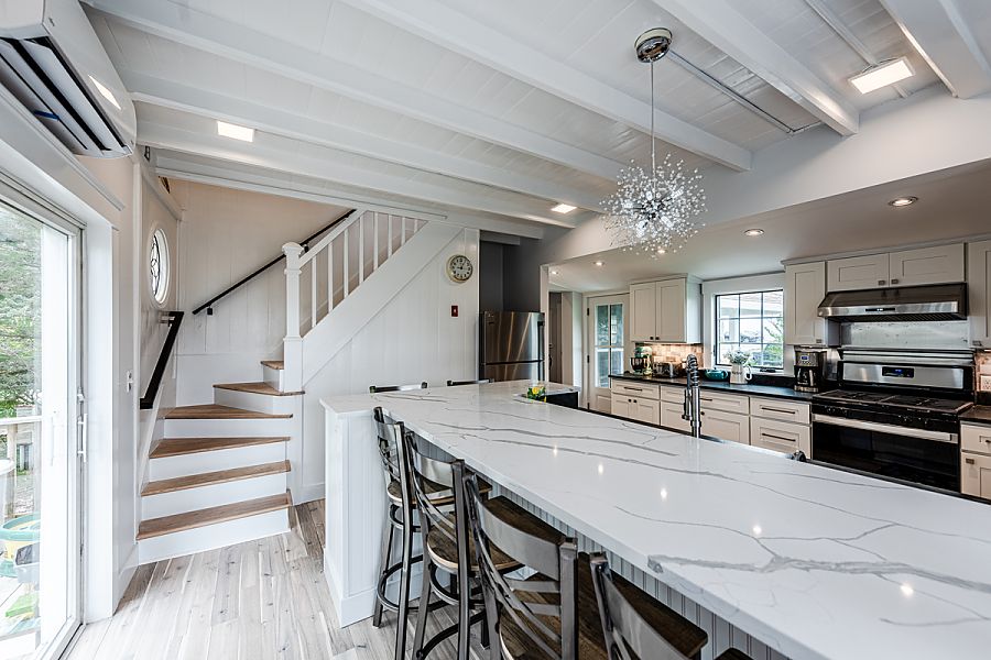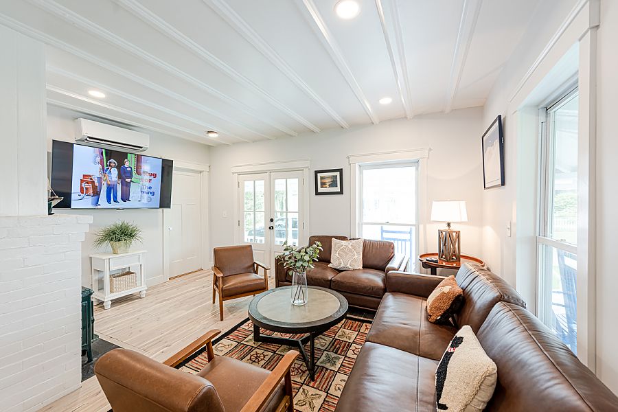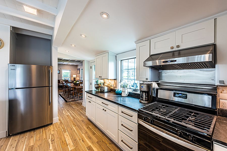 The interior has been completely renovated and features a chef’s kitchen with a large island that seats 8 around the island, stainless appliances, spacious cabinets & counters, and a separate dining area that seats 8 or dine al fresco on the patio.  The main living level hosts a comfortably furnished living area with large screen TV and one of five beautifully furnished bedrooms.  One of three baths is located just outside of the bedroom on the main level