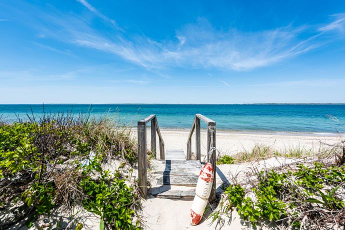 Privately nestled atop a dune with breathtaking views and just steps from a private swimming beach. This immaculate 2 bedroom, 1 bath beachfront cottage offers a tastefully furnished interior with sun-filled rooms...Read more
